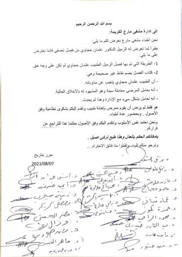 ذكر الأطباء في طلب لهم مقدم لإدارة المشفى عليه أسماؤهم تواقيعهم، أن الفصل صدر لأجل دفاع حجاوي عن زميله له تشاجر مع ممرض تركي تطاول عليه بكلمات نابية بحسب مقطع صوتي لعثمان، فقدم الحجاوي شكوى رسمية لإدارة المشفى، إلا أنه قررت فصله.