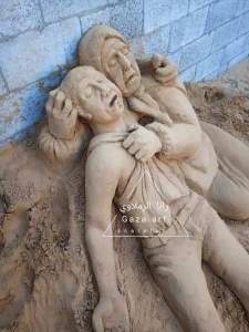 لقد حرّك هذا المشهد وجداني لتخيلِ وجهِ إنسانٍ على الرمل  فبدأتُ بالنحت تدريجيًّا، إلى أن تشكّل فى النهاية مجسمٌّ لتمثالٍ رمليٍّ كامل. لكنه بلا ملامحَ أو تفاصيل》.