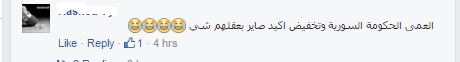 فيما تناول آخر خبر التخفيض بتهكم بتساؤله عما جرى ليدفع بالحكومة لإعلان تخفيض، بعد سلسلة ارتفاعات لمعظم القطاعات والخدمات وكتب ” العمى الحكومة السورية وتخفيض اكيد صاير لعقلهم شي”.